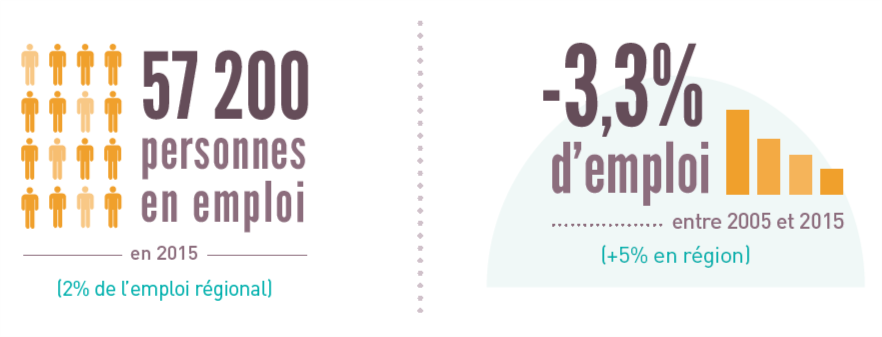 En 2015, 57 200 personnes étaient en situation d'emploi (2% de l'emploi régional). Entre 2005 et 2015, le nombre d'emplois a diminué de -3,3% (+5% en région).