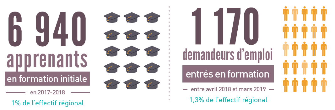 Durant l'année scolaire 2017-2018, 6 940 apprenants étaient en formation initiale, soit 1% de l'effectif régional. Entre avril 2018 et mars 2019, 1 170 demandeurs d'emploi sont entrés en formation. Cela représente 1,3% de l'effectif régional.