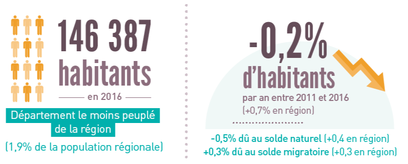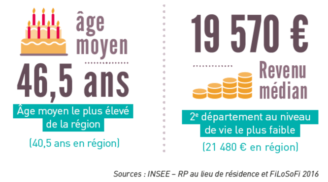 En 2016, l'âge moyen de la population était de 46,5 ans (40,5 ans en région). Le revenu médian est de 19 570€ (21 480€ en région). Cela en fait le 2e département au niveau de vie le plus faible. Source : INSEE - RP au lieu de résidence et FiLoSoFi 2016.