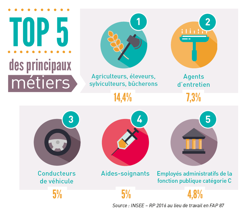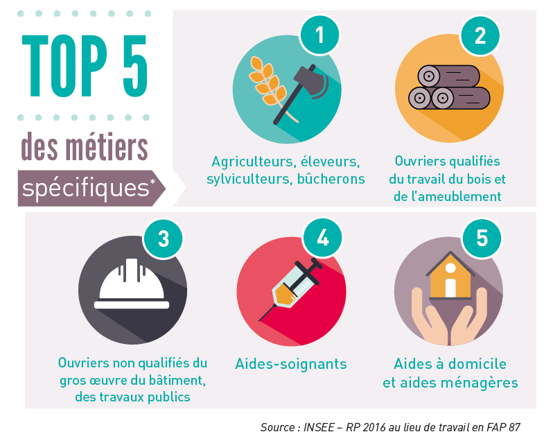 En 2016, le top 5 des métiers spécifiques dans l'Allier étaient : 1-Agriculteurs/éleveurs/sylviculteurs/bucherons, 2-Ouvriers qualifiés du travail du bois et de l’ameublement, 3-Ouvriers non qualifiés du gros œuvre du bâtiment et des travaux publics, 4-Aides-soignants, 5-Aides à domicile et aides ménagères. Source : INSEE - RP 2016 au lieu de travail en FAP 87.