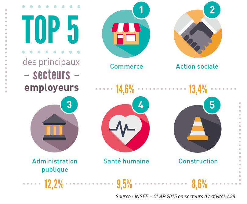 Le top 5 des principaux secteurs employeurs dans le Cantal est : 1-Commerce 14,6%, 2-Action sociale 13,4%, 3-Administration publique 12,2%, 4-Santé humaine 9,5%, 5-Construction 8,6%. Source INSEE - CLAP 2015 en secteurs d'activités A38.