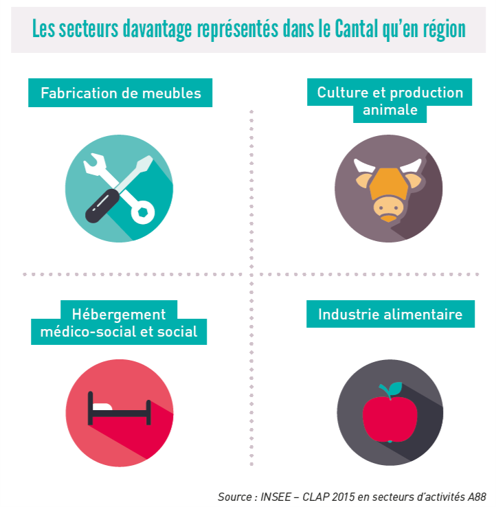 Les secteurs davantage représentés dans le Cantal qu’en région sont : Fabrication de meubles, Culture et production animale, Hébergement médico-social et social et Industrie alimentaire. Source : INSEE - CLAP 2015 rn secteurs d'activités A88.