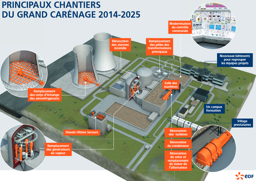 Le "Grand carénage" est un programme industriel de grande envergure visant à poursuivre l’exploitation des centrales nucléaires au-delà de 40 ans, en améliorant la sûreté des installations. Concrètement et en complément de la maintenance effectuée tout au long de l’année pour chacun des réacteurs, il s’agit de remplacer de gros composants (générateurs de vapeur, turbines, transformateurs, etc.), de planifier des opérations de maintenance exceptionnelle et de réaliser les arrêts pour visites décennales.